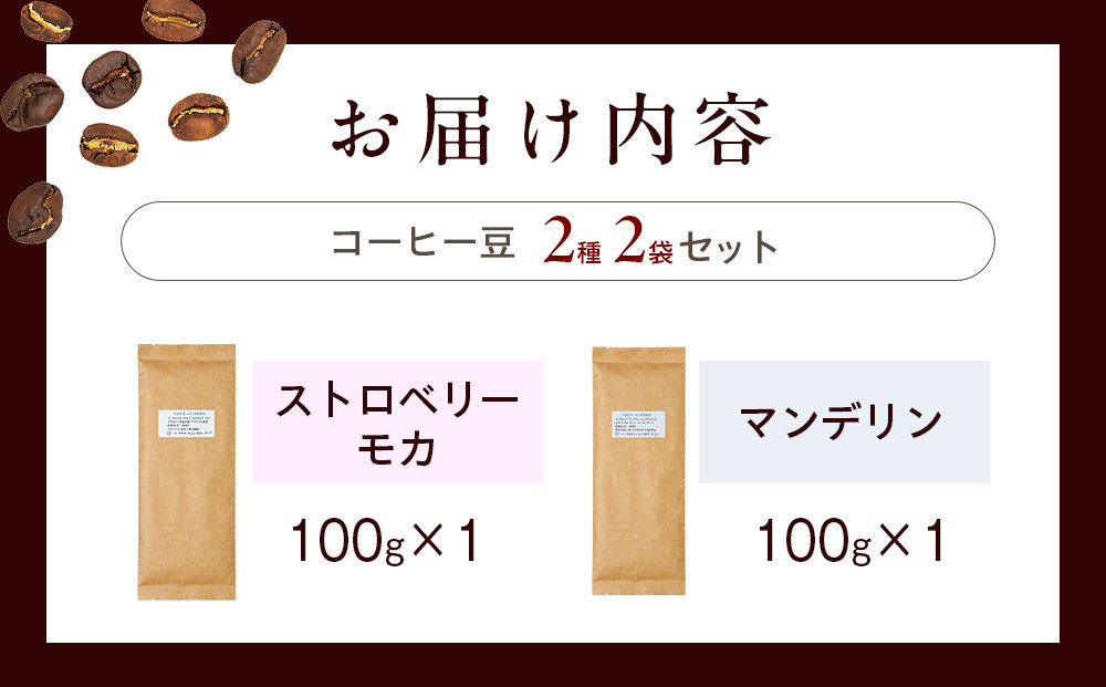 | 容量 | 1.【ストロベリーモカ】100g×1袋 2.【マンデリン】100g×1袋 コーヒー豆:100g×2袋(合計200g) |