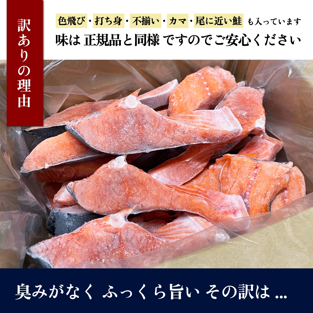 一部、鮭の切り身加工で出た規格外の切り身(打ち身、不揃い、色飛び、尻尾、カマ)を含んでいますが、味は正規品と同様です。