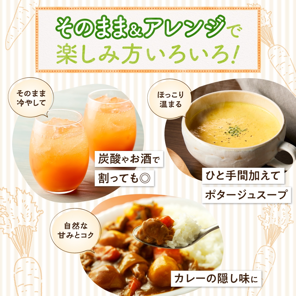 毎月発送の定期便です。 原料は北海道斜里町産のにんじんとレモンだけを使用しており、非常に飲みやすいジュースです。斜里町で育ったにんじんは、寒暖差が大きい中で栽培され甘みが強いので、是非天然の甘さを感じてみて下さい。そのまま飲んでもOK!!カレーやビーフシチューなど料理の隠し味に使ってもOKです。 ■注意事項/その他 ※包装はされておりません。段ボールのままお届けいたします。 ※画像はイメージです。