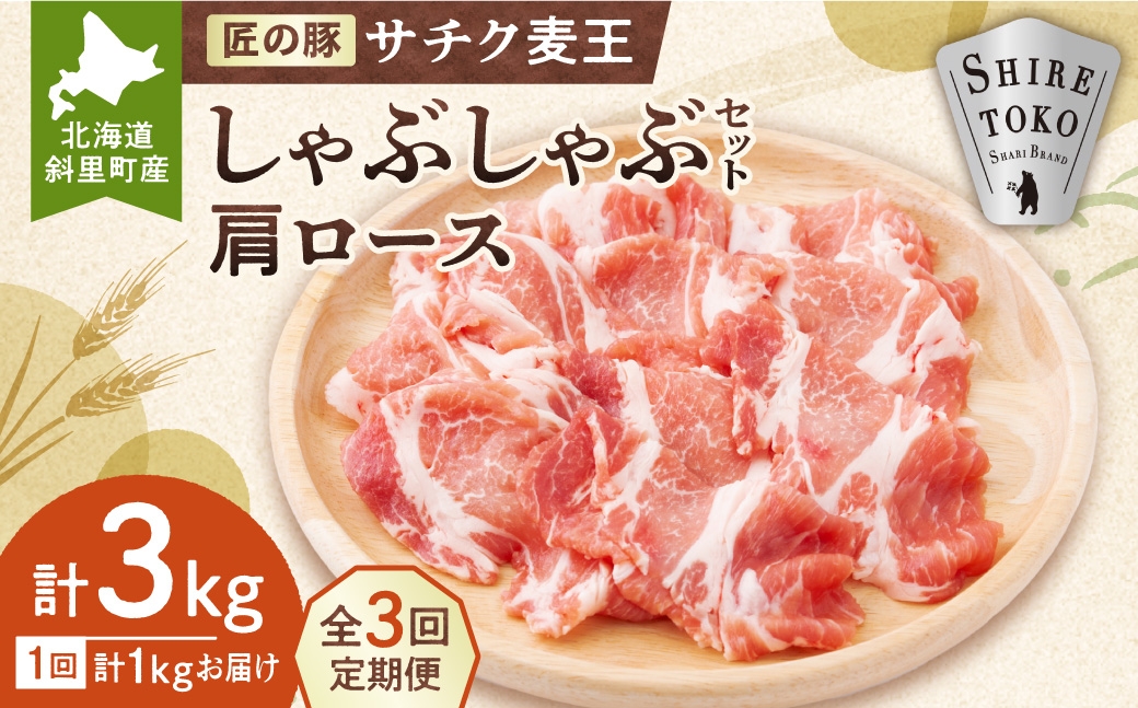 <毎月定期便>北海道知床斜里産豚肉 サチク麦王しゃぶしゃぶ肩ロース500g×2全3回