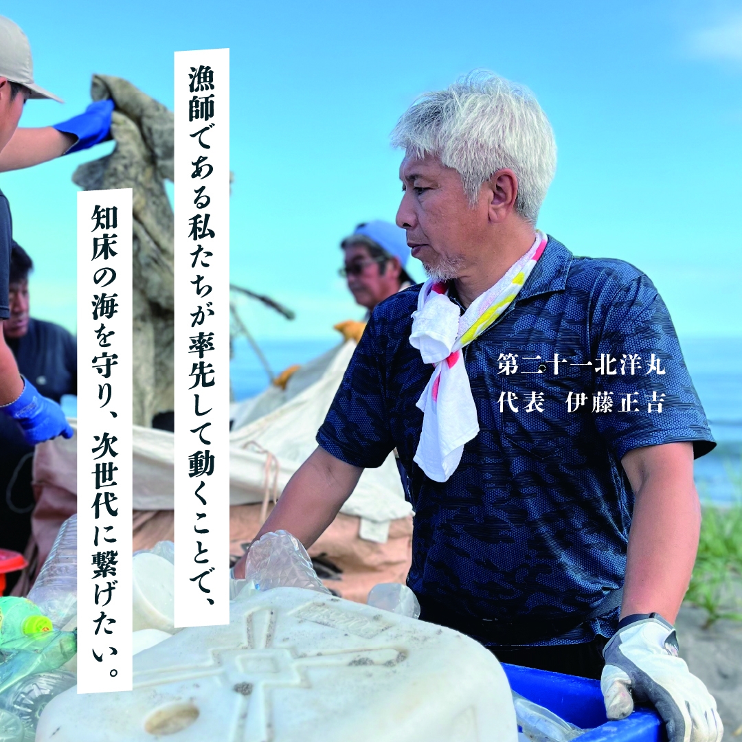 漁師として海の環境保全のために出来ることはないかと考え、2019年から定期的な海岸清掃を続けています。また、近年は地球温暖化防止に貢献するために藻場造成事業も始めました。