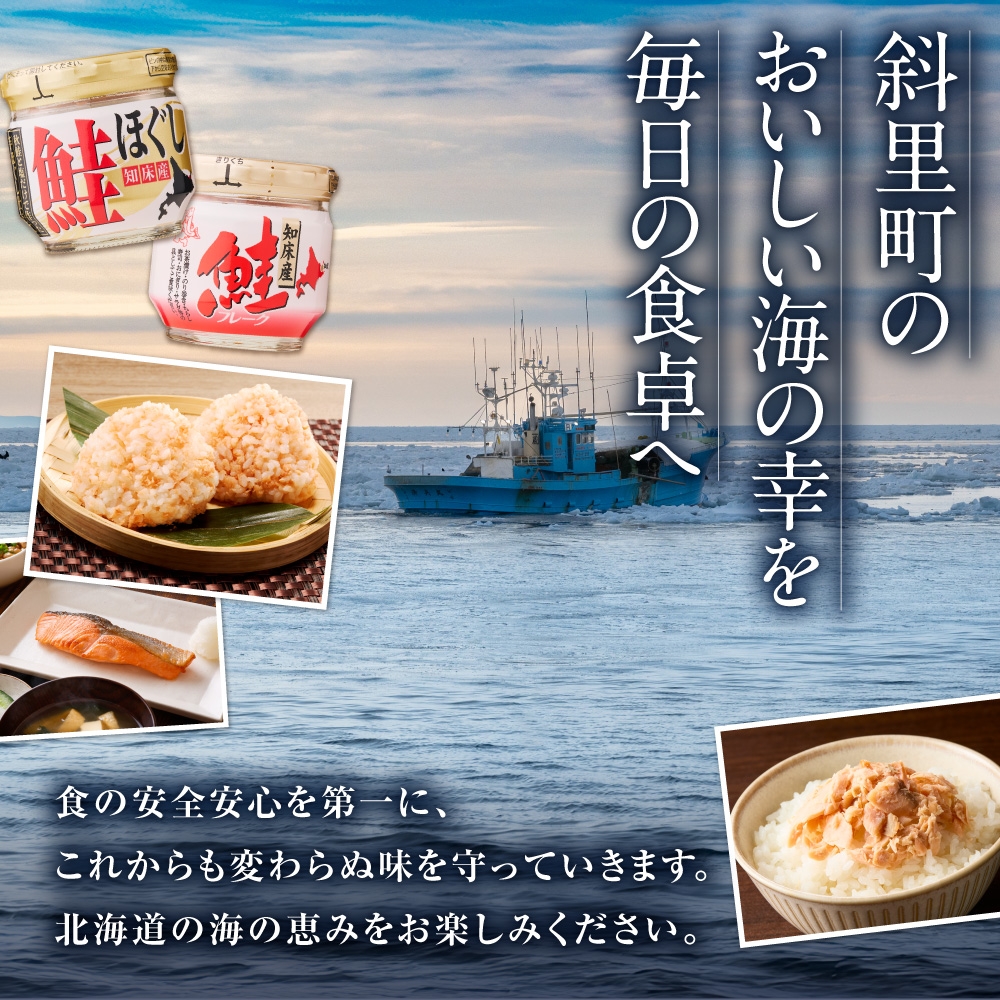 オホーツク海・知床半島周辺海域で漁獲され、その日の内に一次処理された秋鮭を使用。 塩以外のものは一切使用しておりません。 塩を擦り込んで一晩熟成することで、鮭本来のうまみ成分を引き出し、手ほぐしで大粒に仕上げました。 焼きたての鮭をほぐさなければ味わうことのできなかった鮭本来の旨味と食感を、何時でも手軽に味わうことができる製品です。 塩分は控えめですので、そのままでも美味しくお召し上がりいただけます。 塩以外の調味料を使っていませんので、お茶漬けや、サラダ、グラタンなど鮭をほぐして使う料理で手軽にお使いいただけます。 ■生産者の声 地元で水揚げされた秋鮭に、手間と時間を十分にかけることで、鮭本来の色艶、旨味を引き出すことにこだわった製品です。 お茶漬けやおにぎり、その他鮭を使った料理でご賞味ください。 ■注意事項/その他 ※開封後は、冷蔵庫(10℃以下)で保管し、清潔なスプーン等を用いて、お早めにお召し上がりください。 ※鮭を原料としているため骨や鮭の皮が入っていることがあります。 ※瓶の中は真空状態にありますので、スプーン等でキャップの下から空気を入れていただくとあきやすくなります。 ※ビンはワレモノです。開封時には十分ご注意ください。 ※万が一、製品在庫がない場合は、若干お時間を頂く場合がございます。 ※シュリンク包装デザインは、予告なく変更することがございます。 ※画像はイメージです。