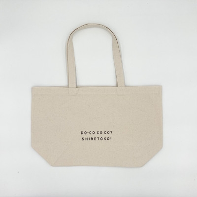 表面にカメラを持ったトコさん、裏面に「DO-CO COCO?SHIRETOKO!」のロゴが入った、両面プリントのトートバッグです。