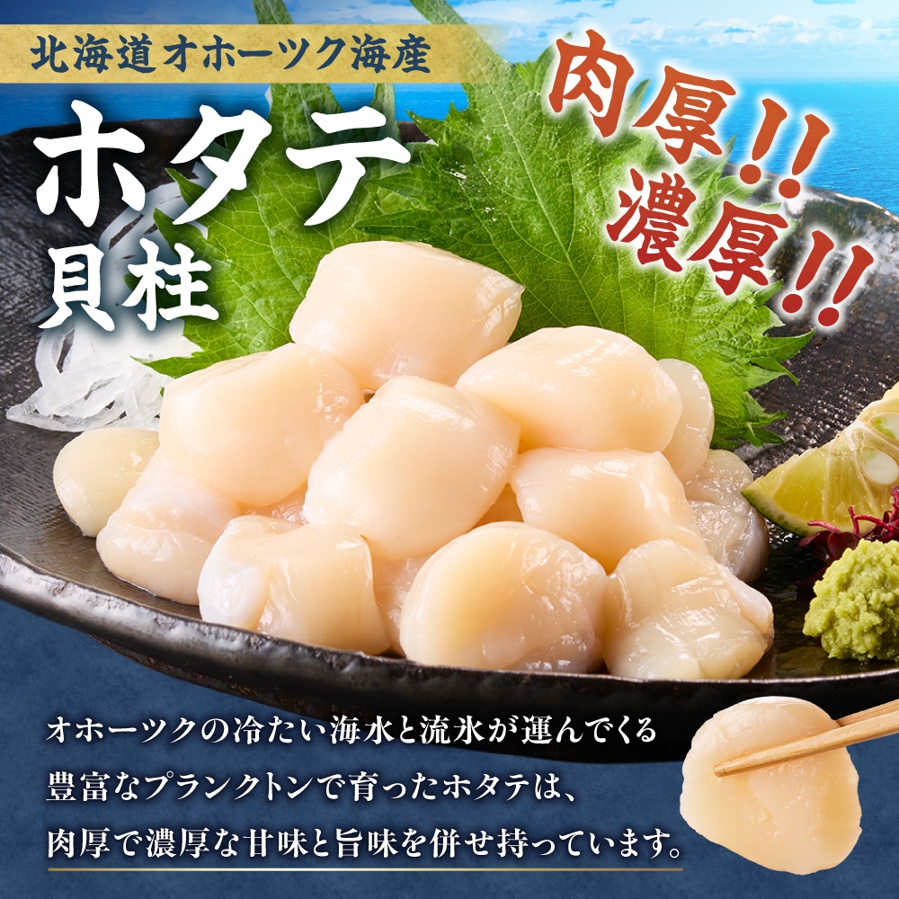 オホーツクの冷たい海水と流氷が運んでくる豊富なプランクトンで育ったホタテは、肉厚で濃厚な甘味と旨味を併せ持っています。