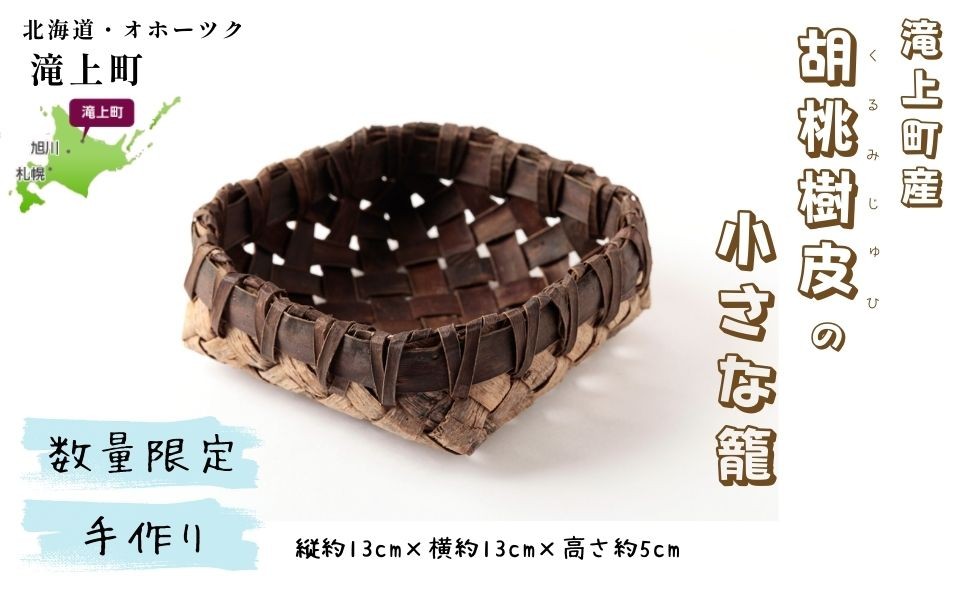 北海道滝上町の野山に自生する胡桃の樹皮で編み上げたかわいらしい小さな籠です。