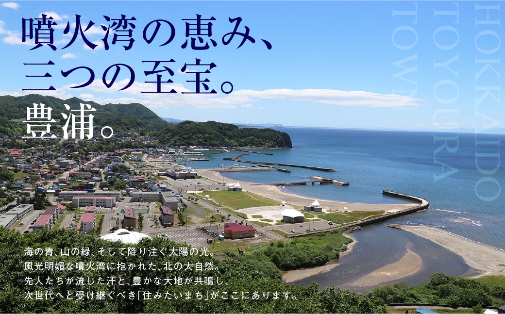 北海道豊浦町は、「海の青」、「山の緑」、「太陽の光」、この風光明媚なボルガノベイ (噴火湾)に面した町です。この北の大自然を大切に、先人たちは多くの汗を流しながら、豊かな町づくりに努力を重ねてきて、現在の豊浦町があり、私たちは、この流した汗にまた一汗一汗適応した施策を推し進め、次世代に受け継いでいかなければならないと考えています。