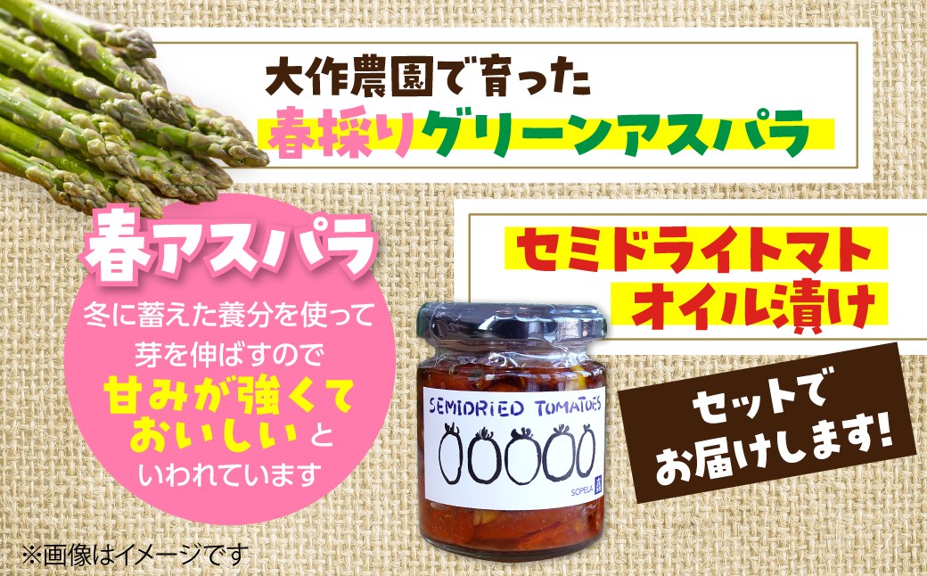 そんな大作農園で育った春採りグリーンアスパラとセミドライトマトオイル漬けをセットでお届け致します!