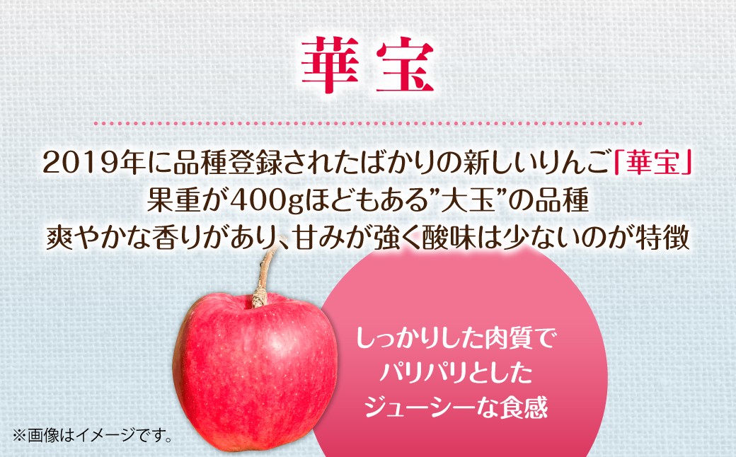 「華宝」は、2019年に品種登録されたばかりの新しいりんごで、果重が400gほどもある”大玉”の品種です。