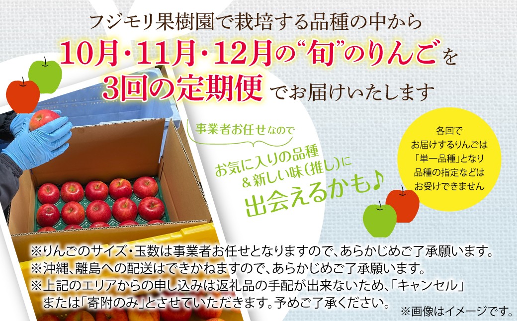 フジモリ果樹園で栽培する品種の中から、配送時期に応じた“旬”のりんごを3回の定期便でお届けいたします。
