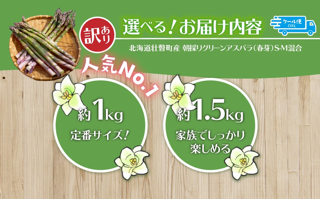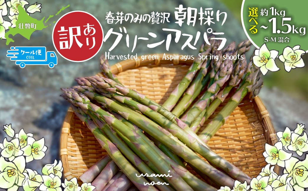 地域の生産者応援の品 【2026年予約】【訳あり】朝採りグリーンアスパラ(春芽)S-M混合 北海道壮瞥町産 選べる容量 約1kg~1.5kg【ふるさと納税 人気 おすすめ アスパラガス 朝採れ 野菜 旬 春 とれたて 甘い 冷蔵 産地直送 グルメ 送料無料】 SBTAJ038-v