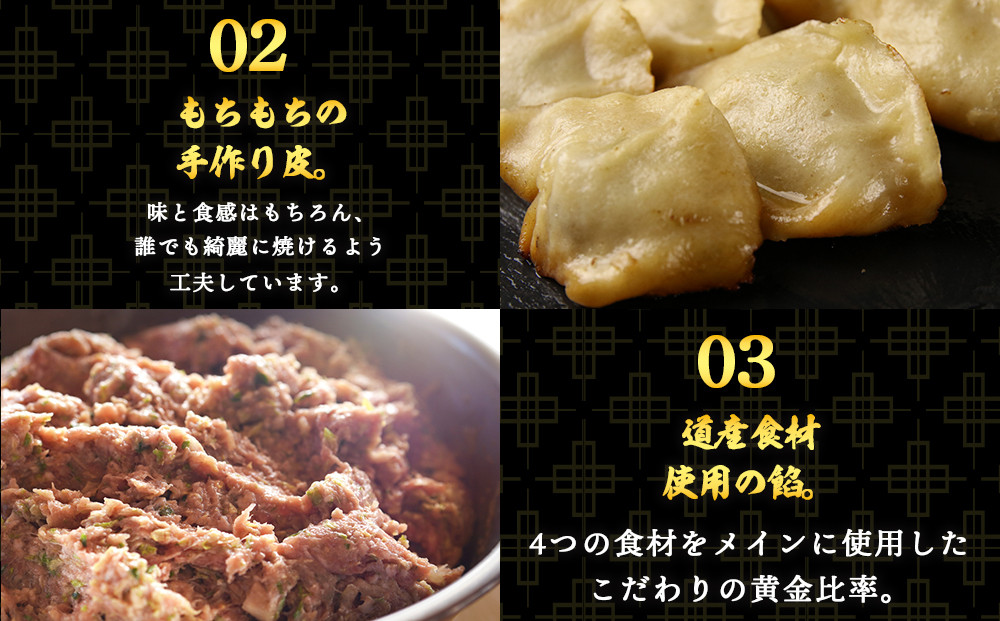 だぶだぶの肉汁をすすりたくなる餃子 40個(10個入×4パック) 皮は「きたほなみ」をはじめとする北海道産小麦のブレンドで 焼餃子は もっちり と! 水餃子は ぷるぷる に! 餃子のたねには背脂を熟成させた手作りラードを練り込むことで、 思わずすすりたくなってしまう、コクと旨みがたっぷりの肉汁があふれます! ニンニクとにらを使わず、山椒をきかせたクセになる後味です。 《中華食堂 杏》 白老町で北海道産小麦粉と豚肉を使用した 手作り冷凍餃子を販売しているお店です。 ◆お礼の品・配送に関するお問合せ先◆ 白老町ふるさと納税コールセンター 営業時間 9:00~17:30(祝土日を除く) TEL:011-807-0176 ※12月は土・日曜日も対応しております