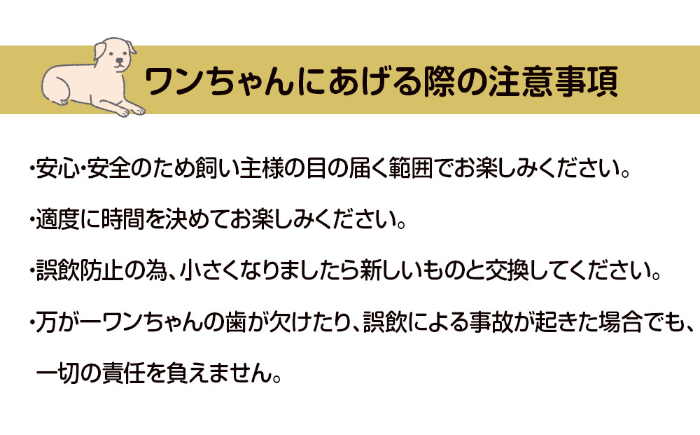 ・万が一ワンちゃんの歯が欠けたり、誤飲による事故が起きた場合でも販売者は一切の責任を負えませんので、飼い主様の自己責任でお楽しみください。