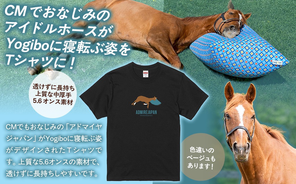 CMでもおなじみの「アドマイヤジャパン」がYogiboに寝転ぶ姿がデザインされたTシャツは、上質な5.6オンスの素材で、透けずに長持ちしやすいです。