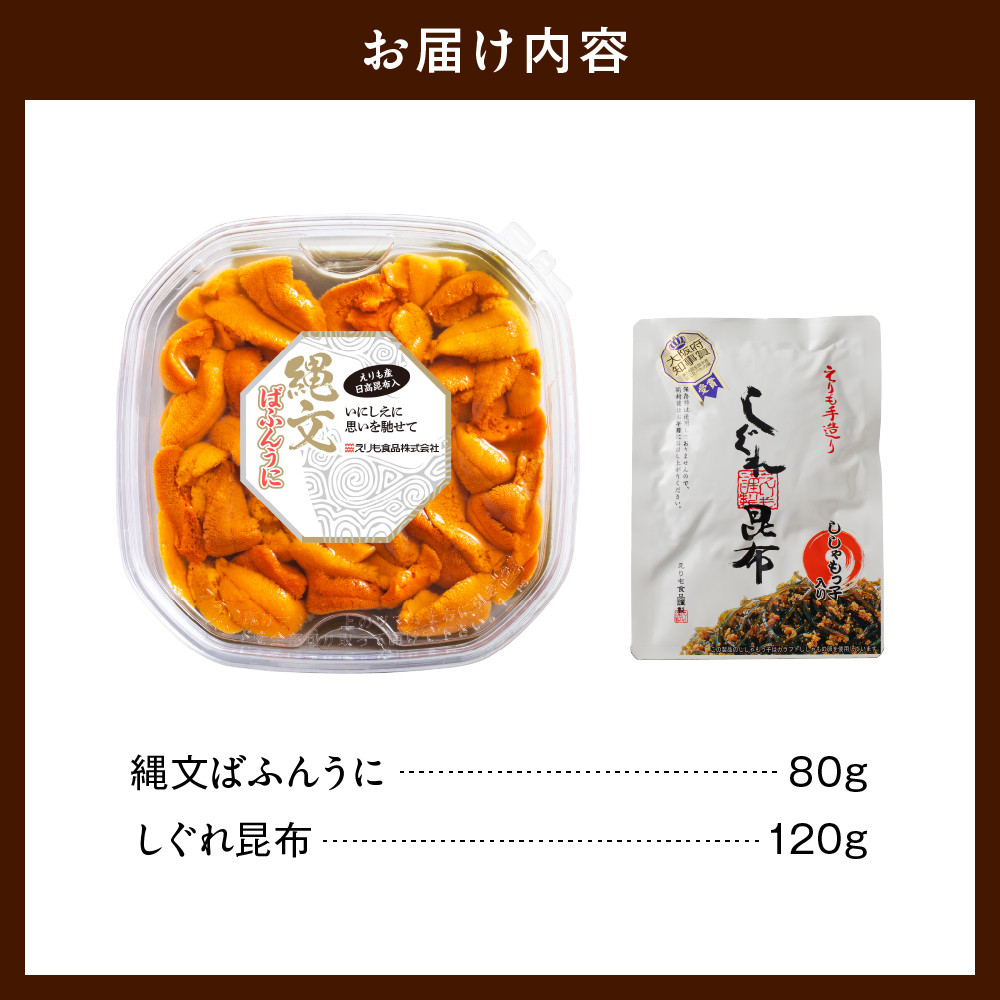 とろけるような濃厚で甘い「縄文ばふんうに」をご堪能ください。 【2024年10月以降発送分】縄文ばふんうに(80g)としぐれ昆布(120g)【er001-052】