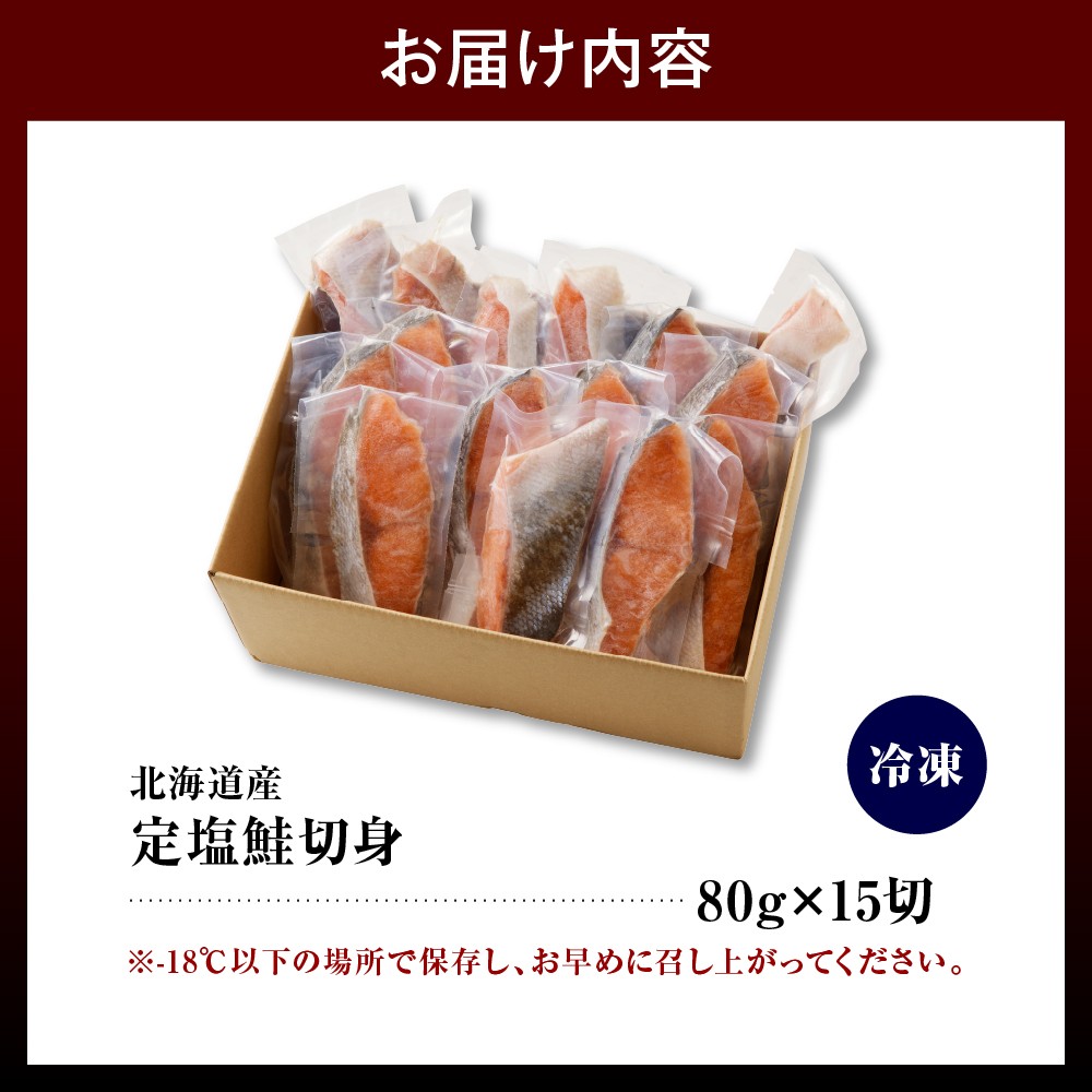 | 容量 | 北海道産定塩鮭切身 80g×15切 【原材料・成分】 秋鮭(北海道産)、食塩 |