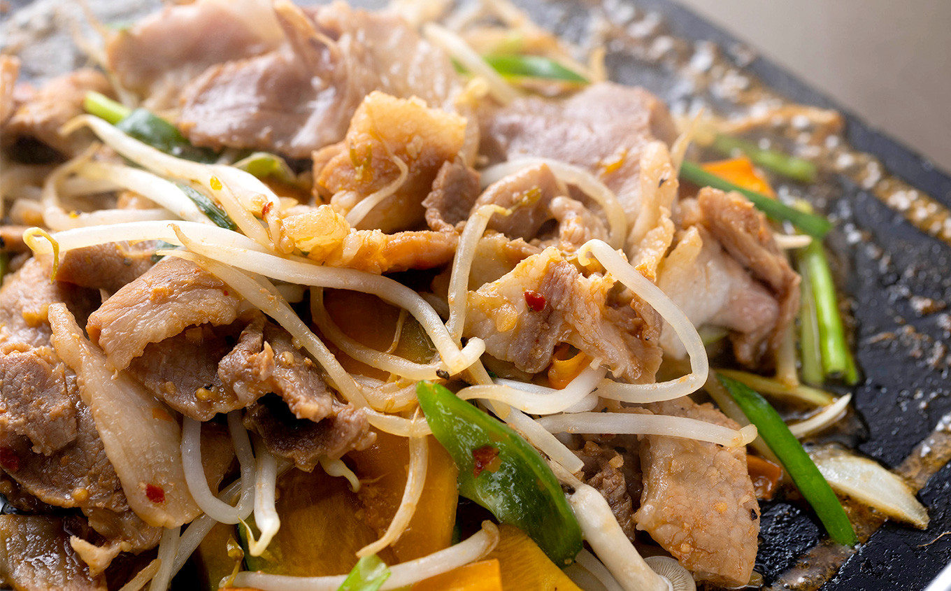 炭火焼き の 香ばしい 豚肉 に タレ が しみわたる
