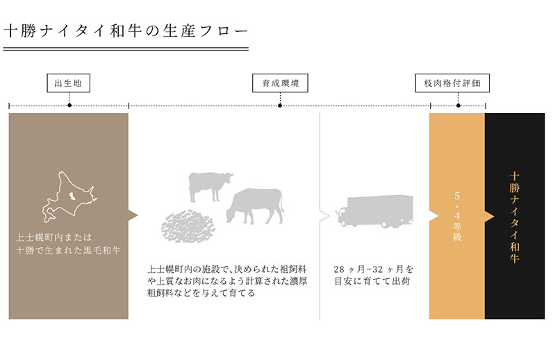 十勝ナイタイ和牛は自然豊かな十勝・上士幌町で育ち、5・4等級かつオレイン酸含有率が55%以上の黒毛和種に与えられる称号です。「オレイン酸」はオリーブオイルの主成分として知られる不飽和脂肪酸の一つで、これを多く含む牛肉は脂の融点が低いため、口溶けや風味が増すと言われています。