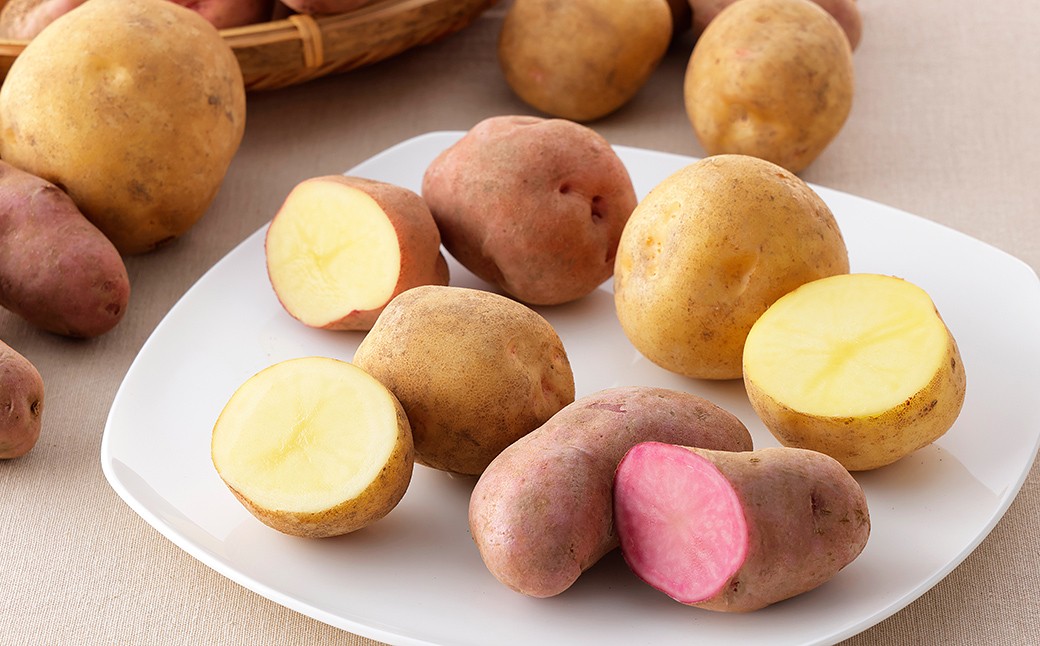 「ホッカイコガネ、キタアカリ、とうや、シャドークィーン、ノーザンルビー、ジャガキッズ、グランドペチカ、ヒカル、メークイン、インカルージュ、アンデス赤」等から、出荷時期に合わせてランダムに4種類を詰め合わせ。色々な料理でお楽しみください。