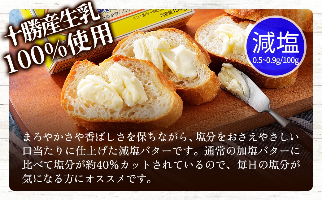 乳原料は北海道十勝産の生乳を100%使用し、ミルクの風味と豊かなコクをぎゅっと濃縮し、上品な味わいに仕上げました。まろやかさや香ばしさを保ちながら、塩分をおさえやさしい口当たりに仕上げたバターを、市販のバターケースにぴったり入る150gサイズでお届け。ご家庭用の冷蔵庫でもコンパクトに収納でき、パンに塗ったり、お料理に加えたり、普段使いできる減塩タイプです。加塩タイプから塩分は約40%カットされており、毎日の塩分が気になる方にオススメです。