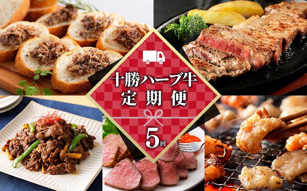 十勝の冷涼・低湿度の気候風土と騒音のない静かな環境で、ハーブを混ぜたエサで長く健康に育てた「十勝ハーブ牛」のステーキや加工品を1ヵ月ごとに計5回お送りする定期便コースです。