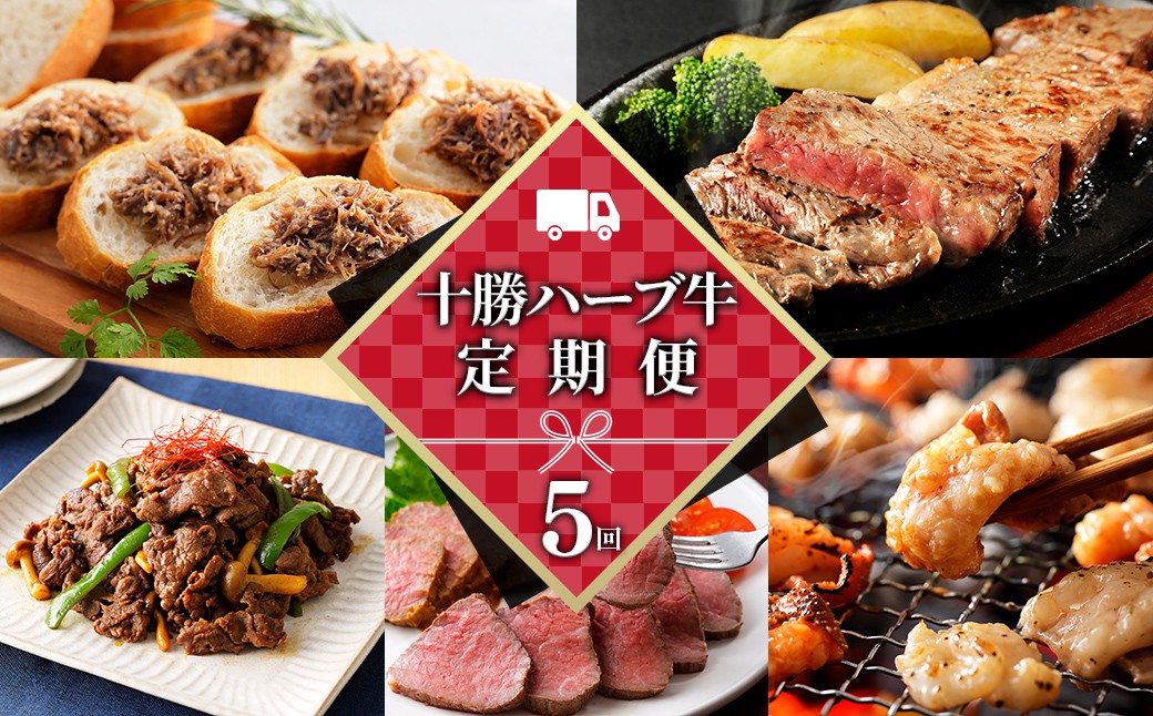 十勝の冷涼・低湿度の気候風土と騒音のない静かな環境で、ハーブを混ぜたエサで長く健康に育てた「十勝ハーブ牛」のステーキや加工品を1ヵ月ごとに計5回お送りする定期便コースです。