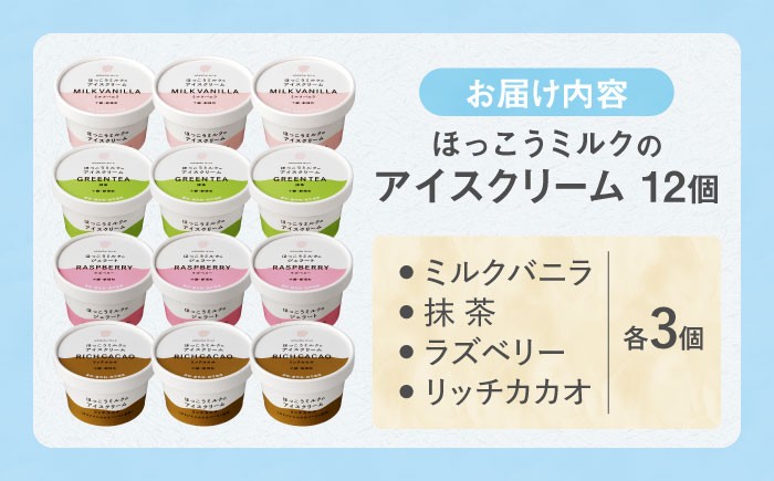 新鮮な生乳を贅沢に使用した濃厚な味わい。ひとさじごとに幸せがめぐるアイスクリーム ほっこうミルクのアイスクリーム 4種セット 計12個(各3個)| 有限会社 北広牧場 [BNBK004]