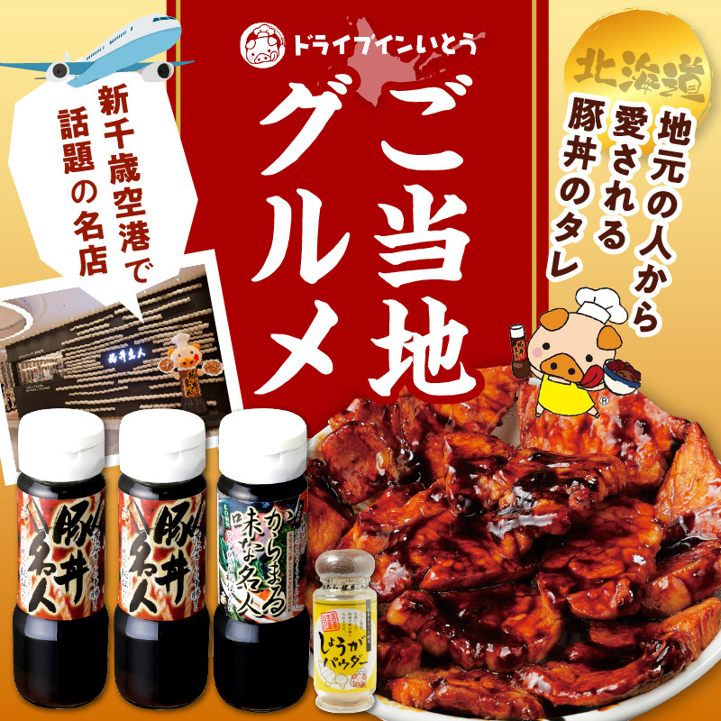 新千歳空港にも出店する豚丼の有名店のオリジナルタレ&調味料セットです。