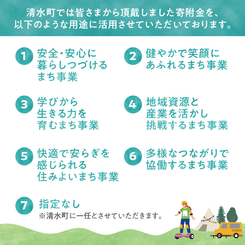 皆様からの寄附金は、清水町が目指すまちの将来像『まちに気づく まちを築く とかち清水~想いをミライに繋ぐまち~』を実現するために活用しています。