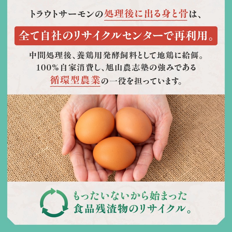 旭山農志塾のトラウトサーモンは、十勝平野の肥沃な土地と自然がろ過した水で育てられており、臭みがなく、身が厚くて味わい深いのが特徴です。