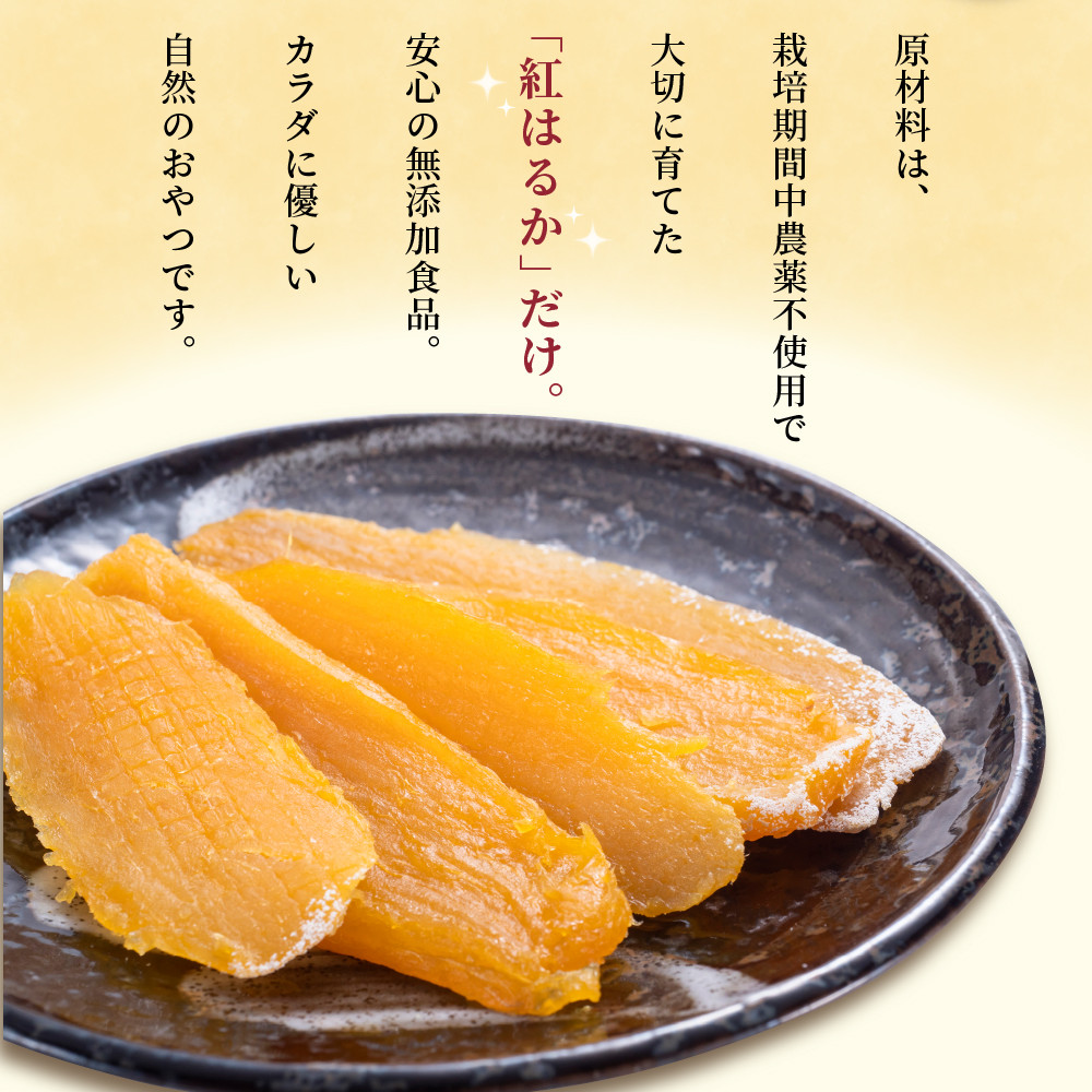 紅はるかは、さつまいもの中でも特に甘味が強く、熟成された芋はさらに糖度が上げっています。コクのある甘味となめらかな干し芋をスイーツ感覚でぜひお試し下さい。少々焼いたり、天ぷらにしても美味しいので様々なアレンジもおススメです。