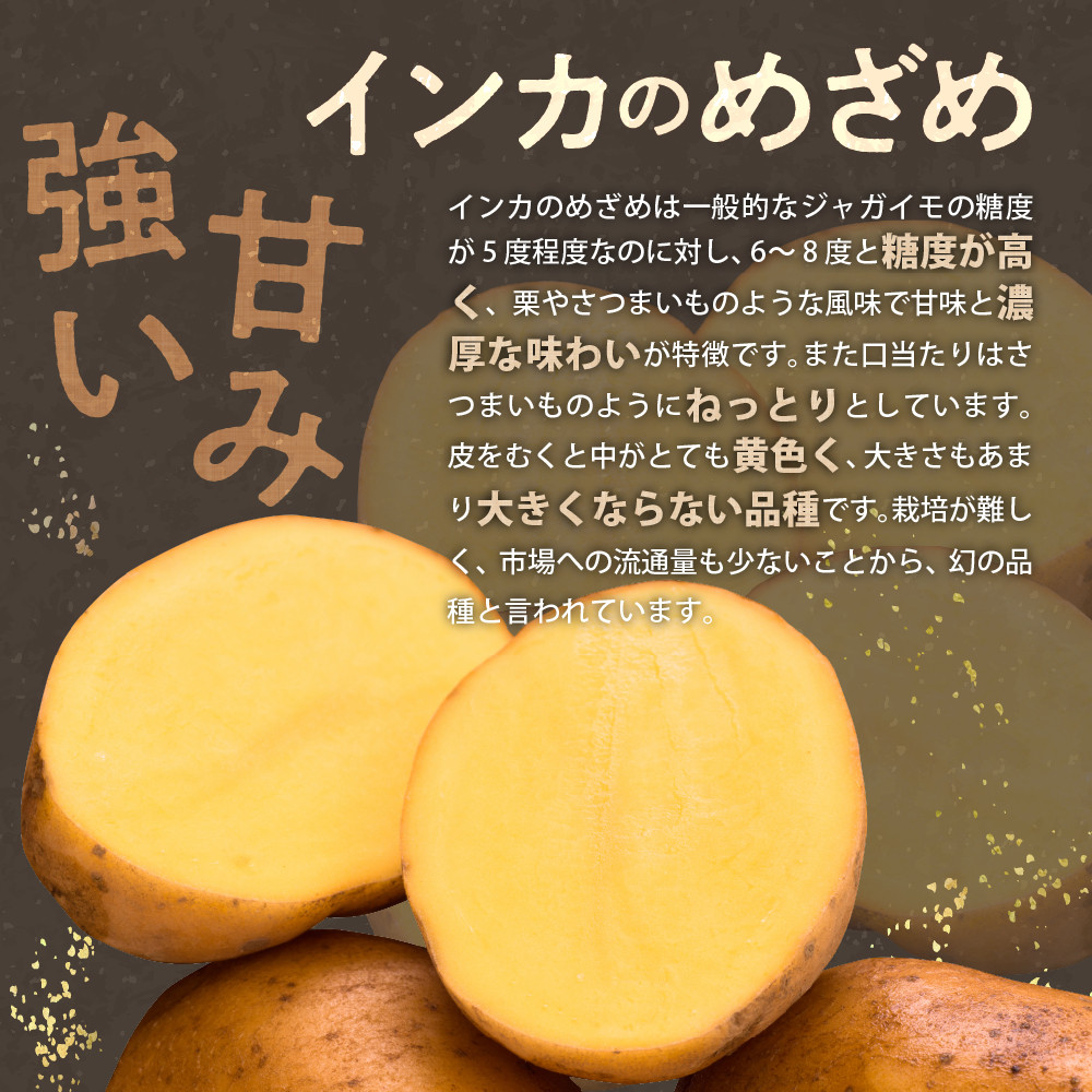 栗やさつまいものような風味とジャガイモの糖度は一般的に5度程度なのに対し、インカのめざめは6~8度と糖度が高く、甘味と濃厚な味わいが特徴です。また口当たりはさつまいものようにねっとりとしています。