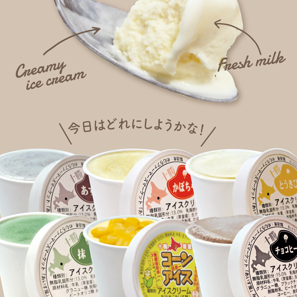 自家生産の健康な母牛から搾った新鮮な牛乳をたっぷり使い、地元の新鮮な野菜、豆類などの素材と十勝産の生クリーム、脱脂粉乳、甘味料にこだわり、安定剤を使わずに、酪農家の母ちゃんが愛情こめて作りました。