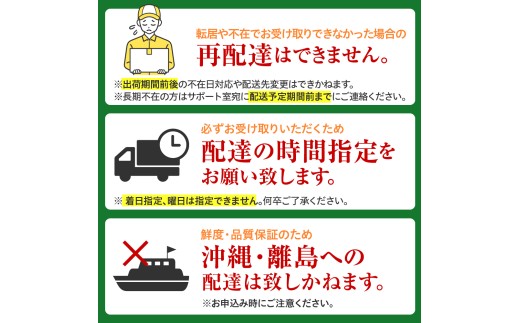 2026年7月下旬~8月上旬頃配送予定 ※お盆中も配送いたしますので、長期不在の方はサポート室宛に配送予定期間前までにご連絡ください。 ※収穫状況により、発送予定から前後する場合がございます。 ※日時指定、曜日指定は出来かねますので予めご了承ください。 |