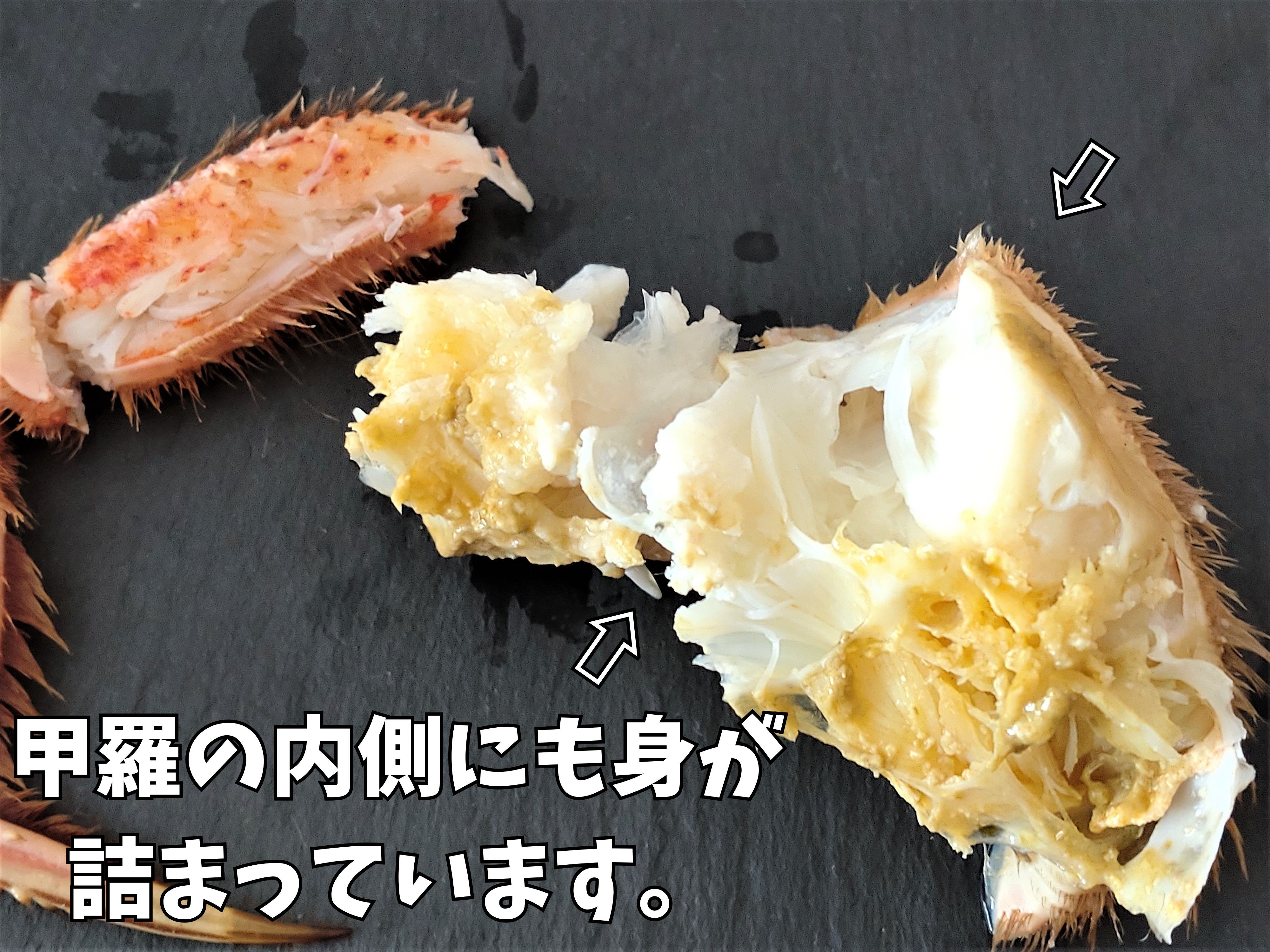 毛ガニの醍醐味であるカニみそも入っており、ご自分でむき身とカニみそを混ぜて甲羅に盛り付ける「甲羅盛り」や、それを火で炙る「甲羅焼き」などを作って楽しむこともできます。