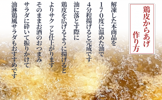 調理法:解凍した鶏皮唐揚げを一枚ずつ170℃に温めた油に入れ。4分程油で揚げれば完成です。