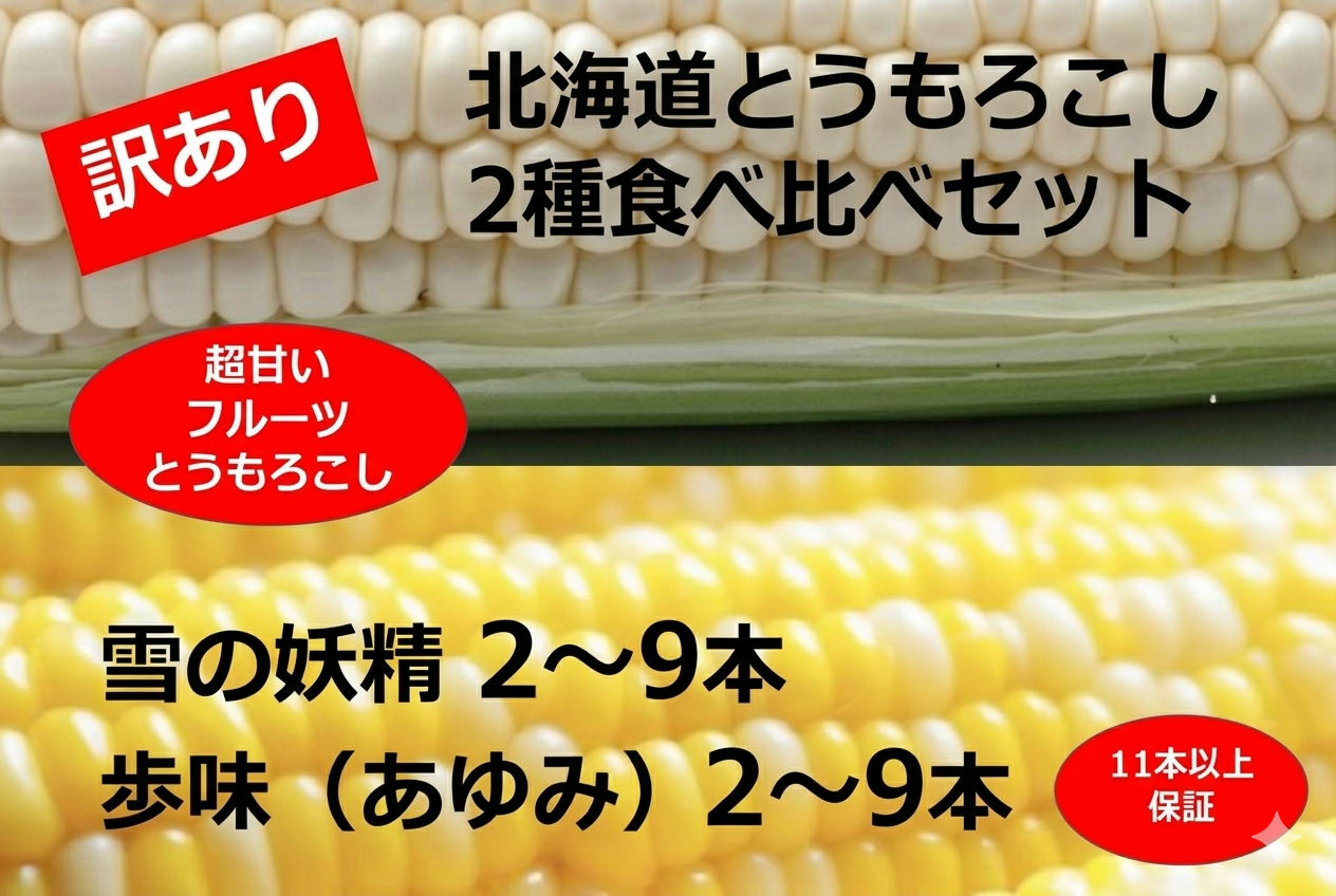 地域の生産者応援の品 果物より甘い、手間暇かけた北海道の奇跡!2種類食べ比べセット 訳あり 訳あり 北海道 とうもろこし 2種類 合計11~12本 食べ比べセット 雪の妖精(ホワイトコーン)2~9本、あゆみ(歩味、バイカラー)2~9本 期間限定 数量限定 トウモロコシ