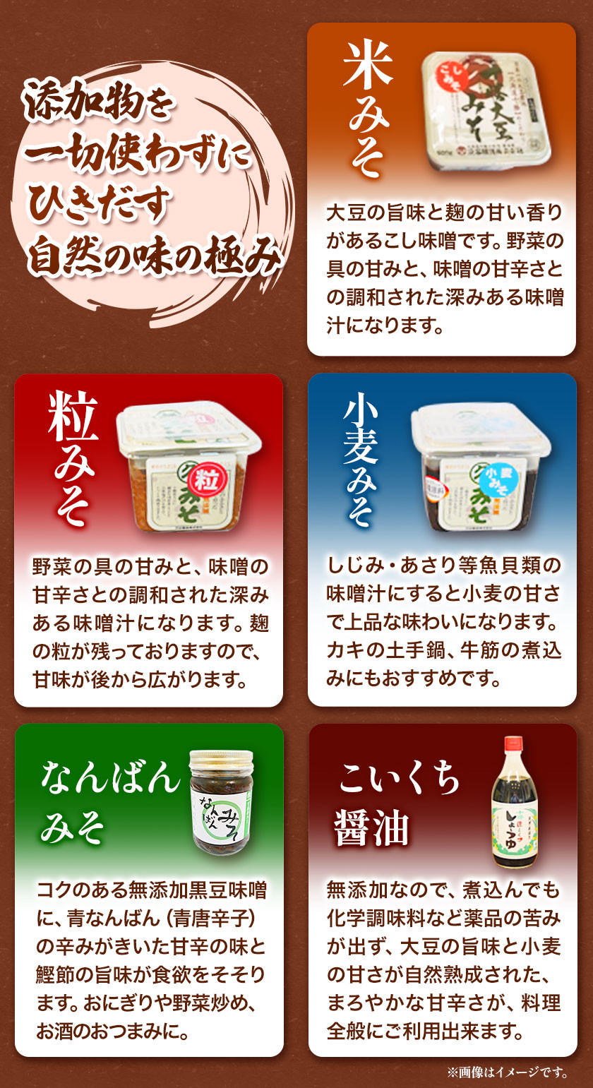 | 容量 | ・無添加味噌3種 各500g (米みそ、粒みそ、小麦みそ) ・なんばんみそ120g×1 ・こいくち醤油(無添加)500ml×1本 |