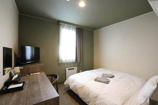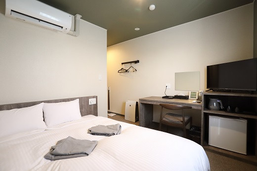 お寿司屋さんが手掛けるシンプルモダンなホテルのクイーンルームのペア素泊まりプランです。