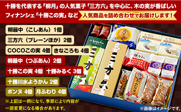 | 容量 | 【一例】 ・三方六(プレーンほか) 2個 ・十勝この実 4個 ・COCOこの実4個 ・月ふわり 4個 ・十勝みるく 3個 ・きなごろも 4個 ・ボンヌ 4個 ・柳最中(つぶあん) 2個 ・柳最中(こしあん) 1個 ・十勝川水ようかん 2個 ※季節により、内容が一部変更になる場合があります。 |