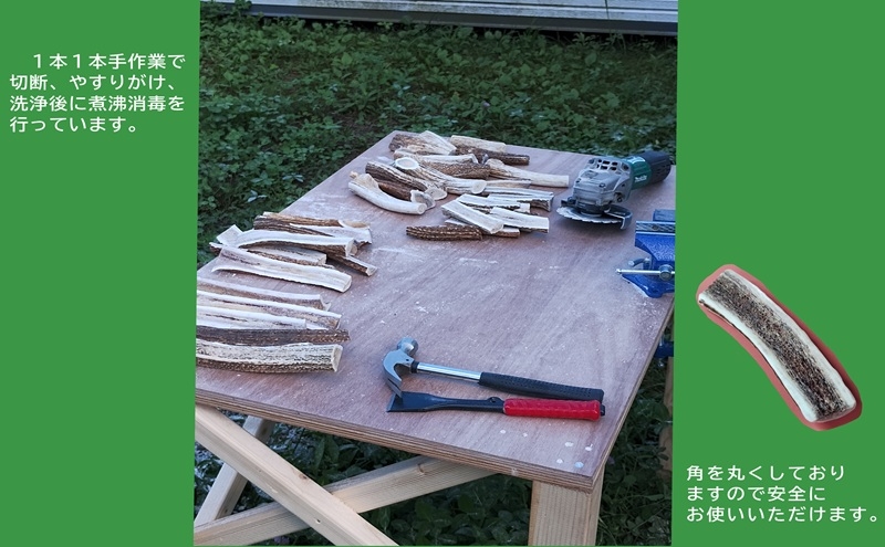 ・鹿角を切断後やすりがけを行い、洗浄後に煮沸消毒をしています。