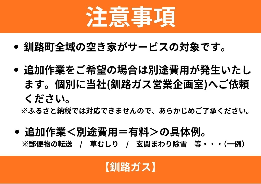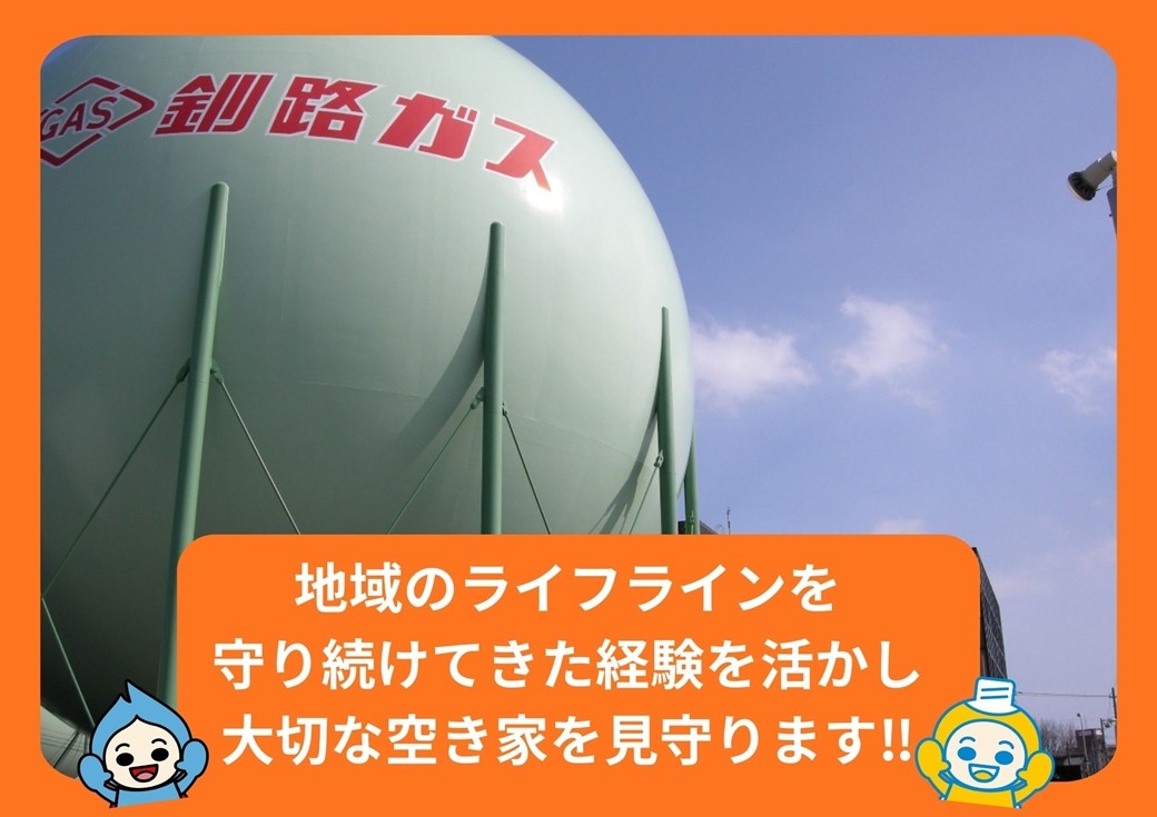 遠方にお住まいの方や、出張・入院などで長く家を離れている方に代わって、釧路町内で都市ガスを提供している「釧路ガス株式会社」が、長年のガス巡回で培った知見や専門技術などを活かして、釧路町内の空き家の現状を確認して報告するサービスです。