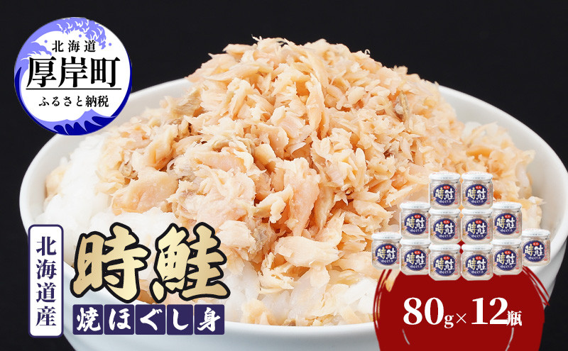 北海道産 時鮭 焼ほぐし身 80g×12瓶 (合計960g) 国産 鮭 ほぐし 鮭フレーク 魚貝類 加工品 ご飯のお供 おかず ご飯に合う おにぎりの具 甘塩仕立て 程よい脂肪分 鮭本来の味 さけ茶漬け チャーハンの具 [№5863-0938]