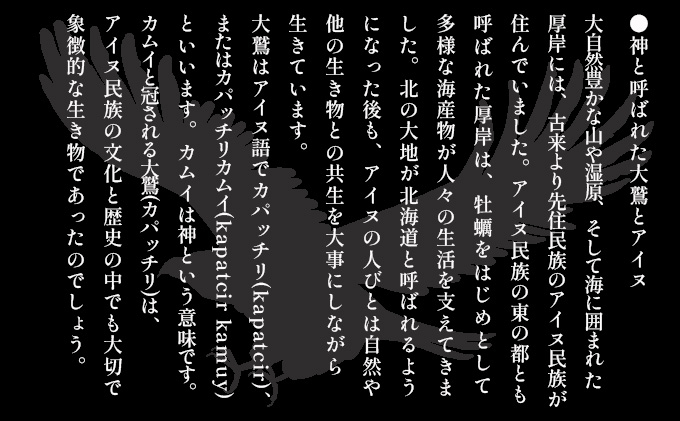 マルユウ海楽の新ブランド牡蠣は、神々しきオオワシを見たときの感動のように、自然味溢れる牡蠣の美しさにより、充足感・幸福感に満たされてほしいという願いから、古くはアイヌをはじめ)北の大地と海で生きる人々を支えてきた「牡蠣」に世界を魅了する「大鷲」を冠して、「大鷲牡蠣」と名付けました。