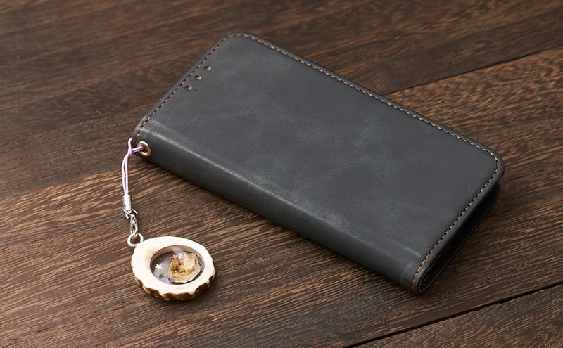 北海道産鹿角(シカツノ)と厚岸産の牡蠣殻のストラップです。