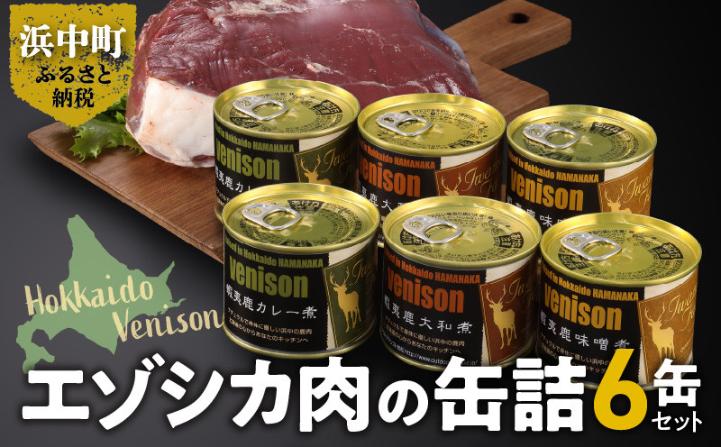 野生で育つエゾシカのお肉を缶詰にしてお届け。低脂肪なお肉でありながら高タンパク。 エゾシカ肉の缶詰セット(6缶)_H0037-002