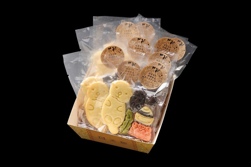 ラッコの好物であるカニやホッキ貝、ウニ、コンブを型取った手のひらサイズのクッキーがセットになっています。