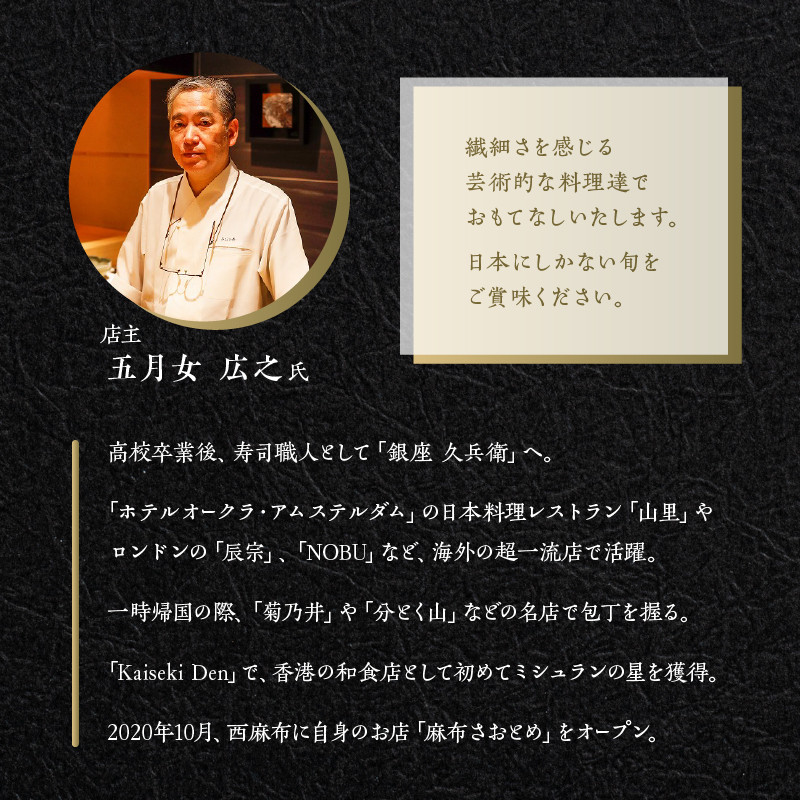 【西麻布 香港で10年連続一つ星懐石料理】麻布さおとめ 世界で美食家を虜にしてきた技【浜中町コース】お食事券2名様_H0044-004