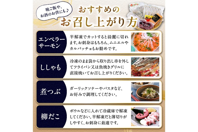 | 消費期限 | 【賞味期限】 ●エンペラーサーモン:製造日から冷凍で1年間 ●ししゃも:製造日から冷凍で60日 ●煮つぶ:製造日から冷凍で90日 ●柳だこ:製造日から冷凍で90日 【保存方法】 冷凍 |