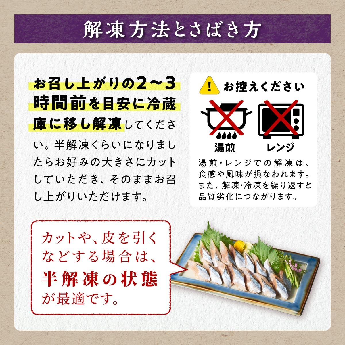 さんま本来の“旬のおいしさ”を、より手軽に、より身近に感じてほしい。その想いで、刺身で食べられるレベルの品質づくりに挑戦してきました。ご家庭で美味しく召し上がっていただくために、ゆっくり冷蔵解凍をおすすめしています。急激な解凍は旨味のドリップが出やすく、食感や香りが損なわれる原因になります。冷蔵庫で半日ほどおいて解凍し、解凍後はお早めにお召し上がりください。