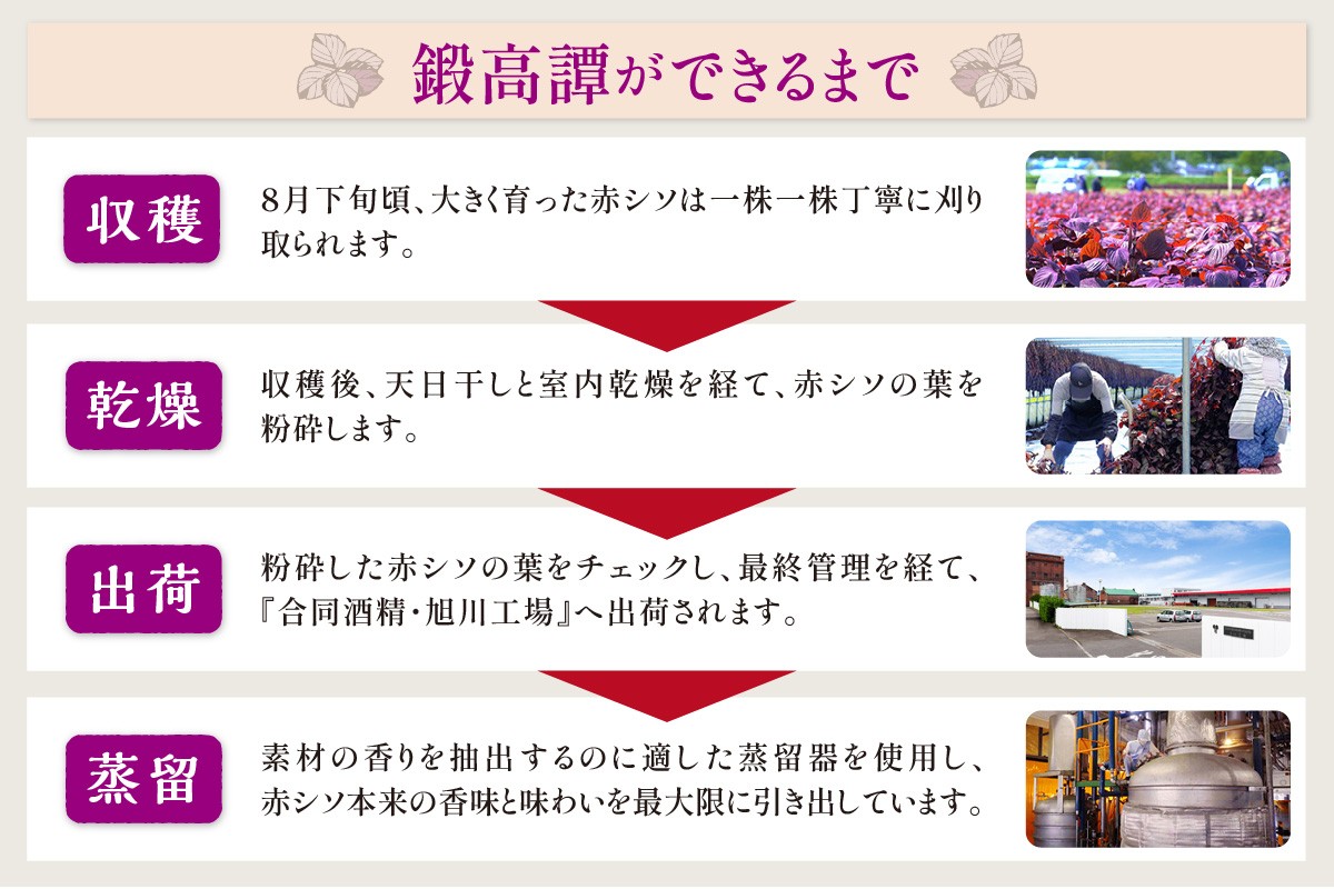 北海道白糠町の契約農家が「鍛高譚」のためだけに丁寧に栽培した香り高い赤シソを使用しています。